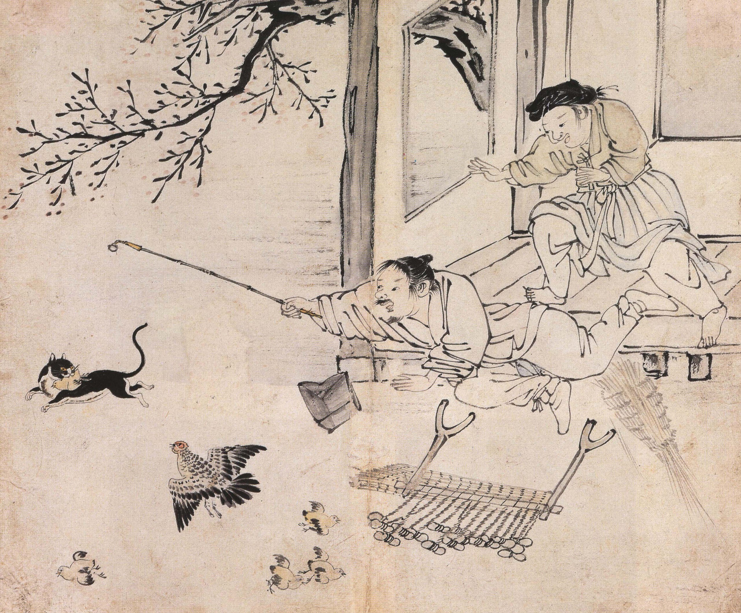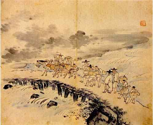 나귀를 탄 사람은 차림새로 보아 한눈에 양반임을 알 수 있다. 반면 허리를 깊게 숙이고 절을 하듯, 두 손을 공손히 모아 인사를 하는 남녀는 양반이 아닌 것으로 보인다. 길에서 만난 이들은 무엇을 하는 것일까?