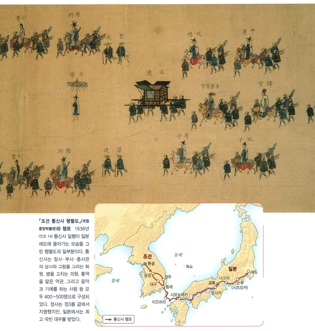 통신사 행렬도를 보고, 일본 사람들이 조선 통신사 일행을 대우한 모습을 이야기해 보자. 일본 지식인들은 우리 나라 통신사 일행이 머무르는 곳마다 몰려들어, 학문과 기술, 예술 등 우리 나라의 선진 문화를 받아들이고자 노력하였다. 그리하여 우리 사절과 일본 학자들 간에는 활발한 문화 교류가 이루어졌다. 특히, 조선의 유학은 그들의 정신적 바탕이 되었고, 학문을 발전시키는 데 큰 도움이 되었다.