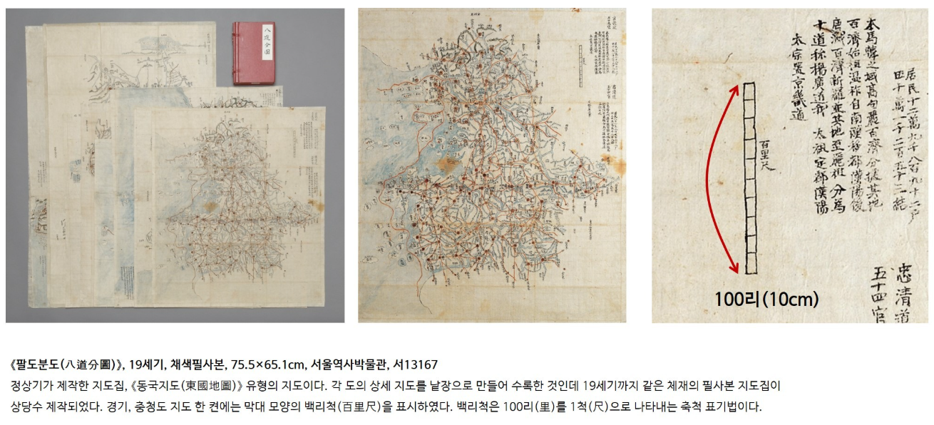 최근까지 많은 연구 성과가 쌓여 《대동여지도》를 비롯한 김정호의 지도 제작 과정과 성과에 대해 우리는 보다 객관적인 시선으로 바라볼 수 있게 되었다. 18세기 이전까지의 지도는 비교적 넓은 지역을 간략하게 나타내는 소축척지도(小縮尺地圖)가 대부분이었다고 한다. 또한 넓이와 형태가 제각각인 각 지방을 동일한 크기의 지면 안에 담아냈기 때문에 같은 지도책 안에서도 지도마다 축척이 달랐으며 지역 간 경계를 맞추어보기도 어려웠다. 그런데 18세기 중반에 이르러 실학자이자 지도학자였던 정상기(鄭尙驥, 1678~1752)가 『동국지도(東國地圖)』를 제작하며 각 도별(道別)지도에 ‘백리척(百里尺)’이라는 일정한 축척을 적용하여 실제 거리를 산출할 수 있고, 도별지도를 이으면 조선전도가 되도록 고안하였다. 또한 약 1:420,000 축척의 비교적 큰 지도로 제작하여 함경, 평안도 지도의 부정확성을 극복하면서 한반도의 윤곽을 실제에 가깝게 그려내 지도 제작 수준을 한 단계 끌어올렸다.