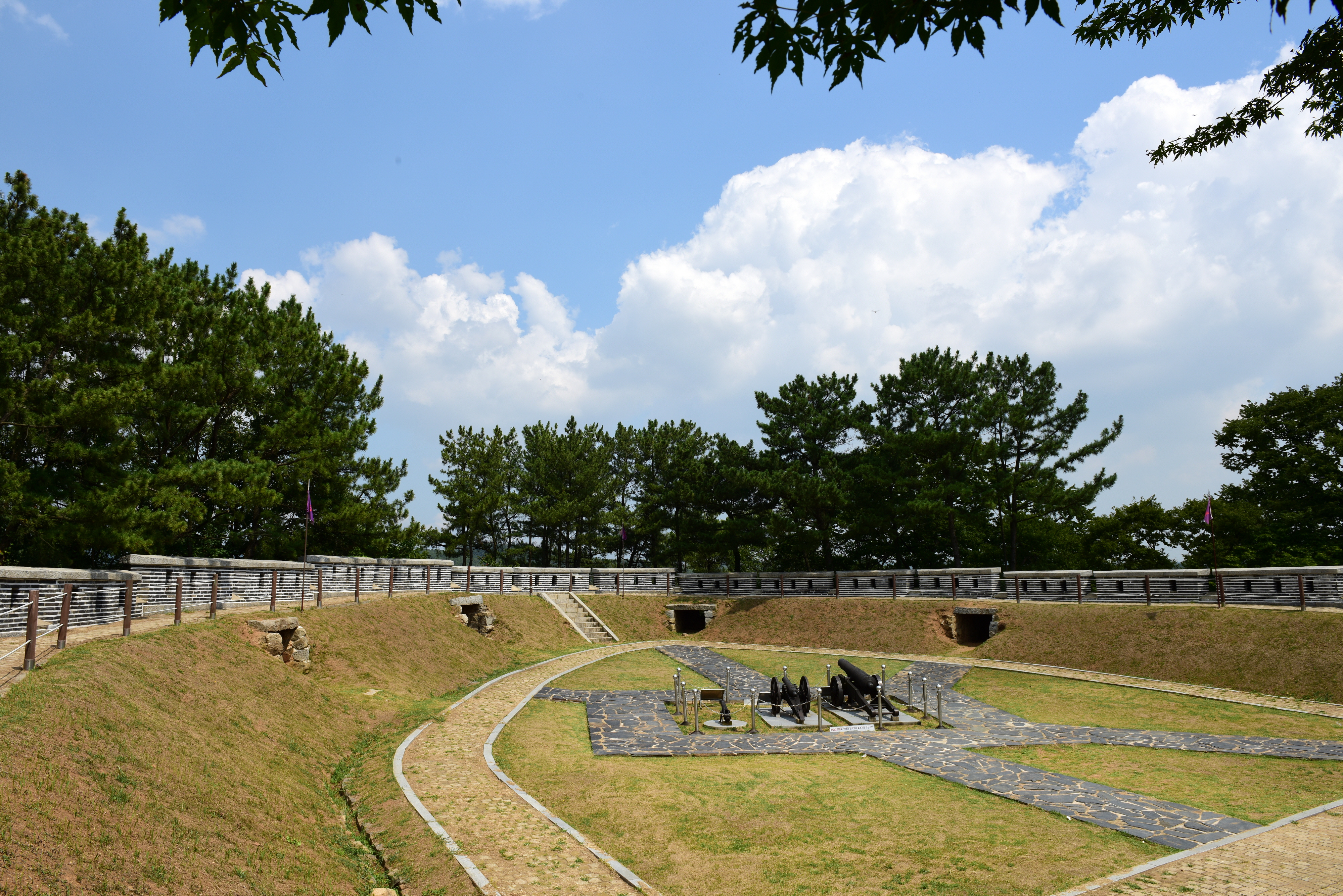 **돈대(墩臺): 경사면을 절토하거나 성토하여 얻어진 계단 모양의 평탄지를 옹벽으로 받친 방위시설.